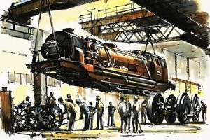 A Beyer-Garratt boiler section lifted clear of the two end units during an overhaul